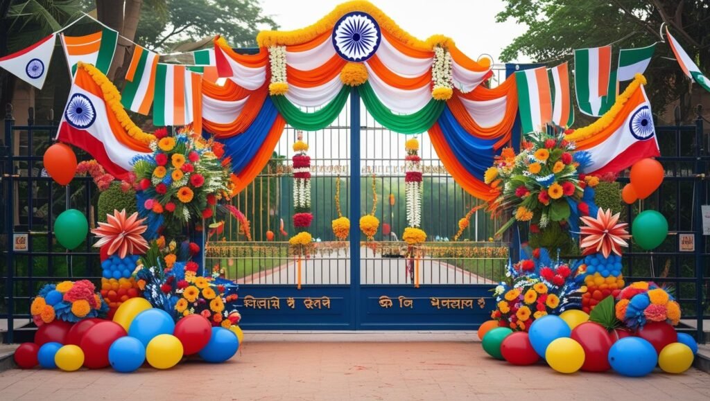 | Basic Decor | Tricolor balloons, flag stand | Small societies or housing towers |