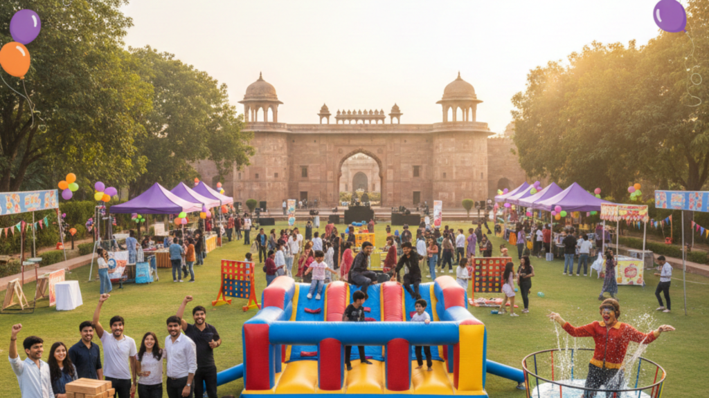 Carnival-style setups are especially popular for large gatherings. Brightly colored game booths, ticket-based play systems, and prize counters create a mini fair experience right inside your venue. This format works beautifully in both residential societies and banquet halls.
