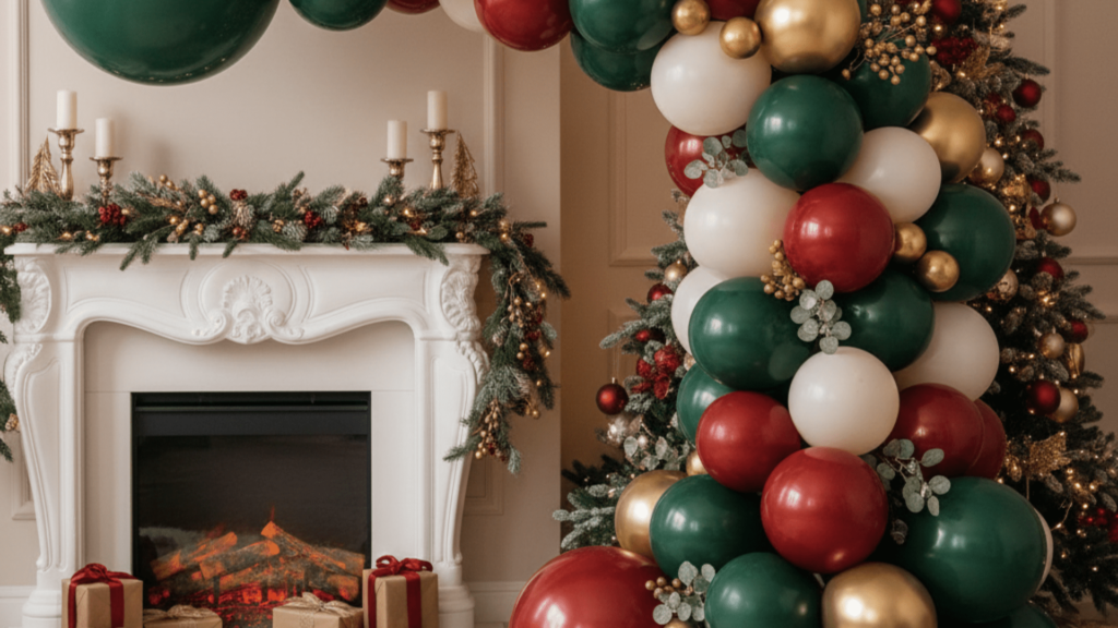 Nature-inspired décor has also entered the holiday balloon scene. Deep greens paired with metallic gold or champagne shades give a refreshing, sophisticated finish. These Christmas Balloon Colours Palettes work beautifully for outdoor celebrations, garden-themed Christmas brunches, and rustic winter setups. When combined with wooden props, pine leaves, fairy lights, and minimalist ornaments, they create a warm, cozy Christmas atmosphere that feels organic and stylish.