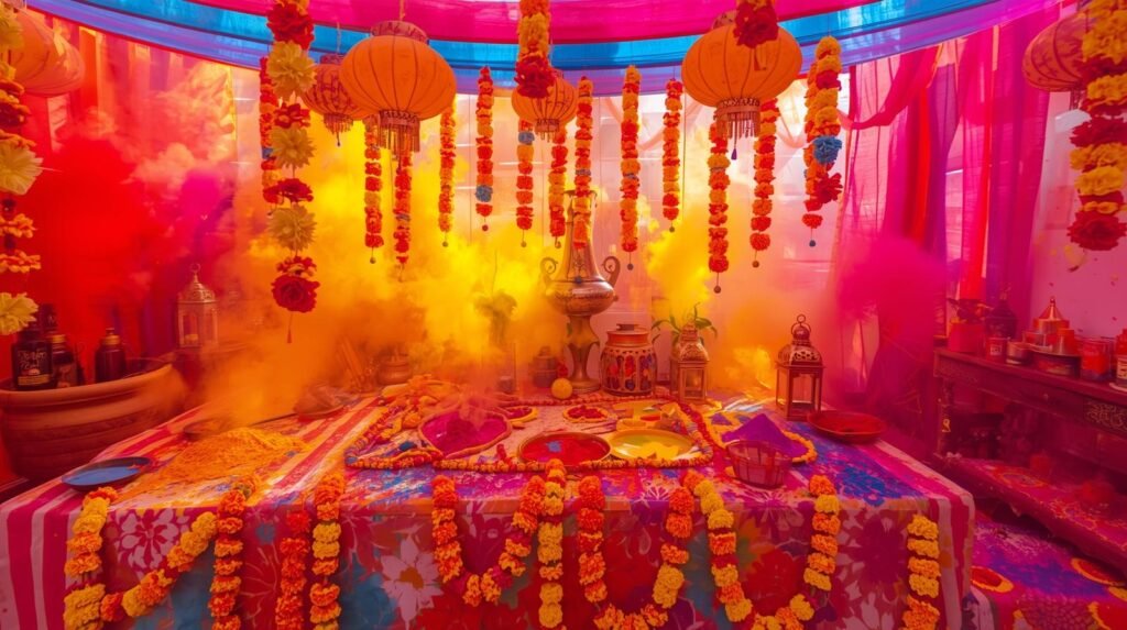 A photo booth is always a crowd favorite! Decorate a corner with balloons, flowers, or colorful fabrics. Add fun props like sunglasses, gulal trays, and hats. Guests will love capturing memories at your themed photo zone.