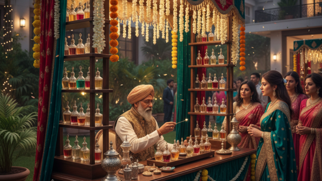 While décor attracts attention, the real magic of an itra stall comes from the fragrance collection. Offering a diverse range of attars ensures that every guest finds something they love.