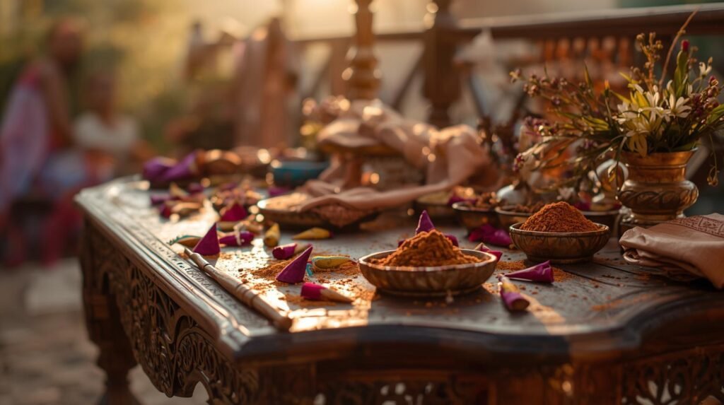Traditional props such as painted umbrellas, colorful kites, brass pots, and decorative carts are frequently used in mehndi décor. These elements reflect cultural traditions and add character to the event space.