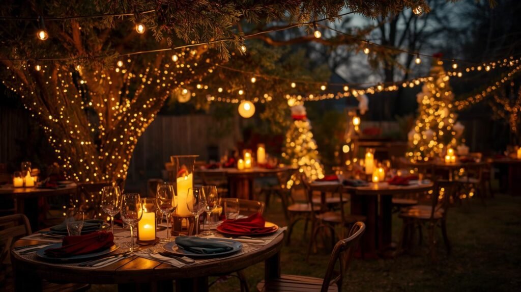 Consider wrapping trees or pergolas with warm white lights and using LED candles on tables for a soft glow. Solar-powered lights or battery-operated options work well for areas without electricity. This step ensures your Outdoor Christmas Party Setup is both practical and visually stunning.