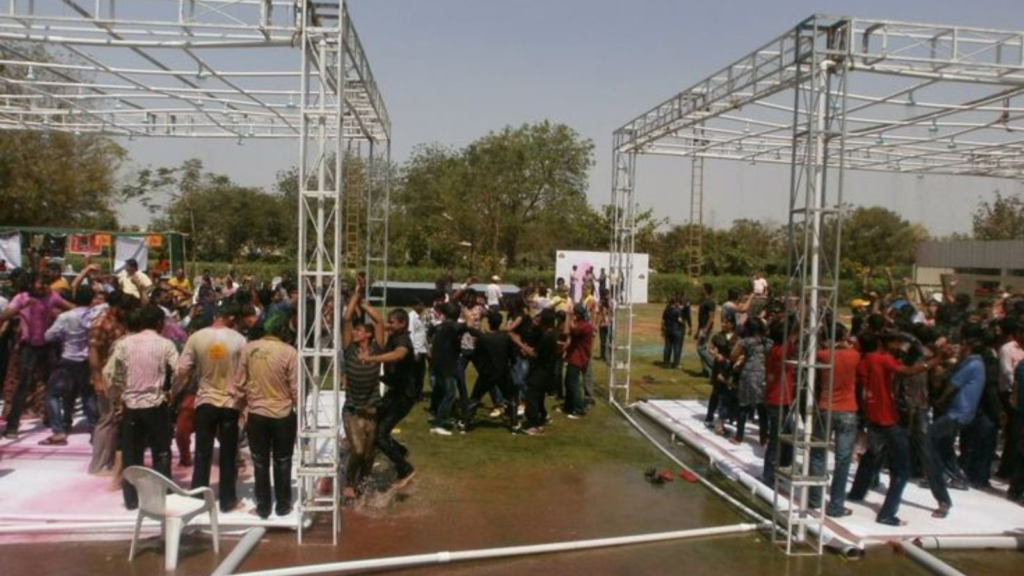 A well-organized setup is the backbone of any rain dance party. Typically, it includes high-pressure showers, anti-skid flooring, water tanks, and a powerful sound system. Additionally, LED lighting and waterproof speakers enhance the party vibe, especially during evening events.
