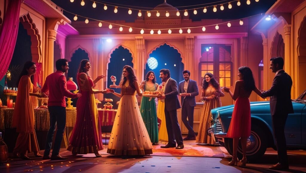 - Décor: Vintage film posters, colorful drapes, Bollywood cutouts.